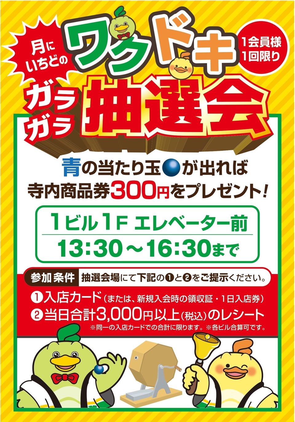 大阪店 2025/10/19(日) 月に一度の「ワクドキガラガラ抽選会」のお知らせ ▶▶次回の開催日はこちら (1ビルの電子チラシよりご確認ください。) ※「入店カードナンバー宝くじ」は2025年10月をもって終了いたしました。
