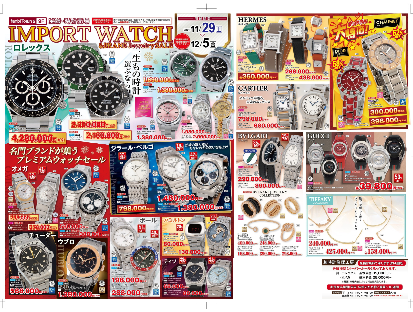 TOWN 2 2025/11/21(金) 2ビル9階 宝飾・時計売場 インポートウォッチセール開催 インポートウォッチセール開催 期間:11/29(土)~12/5(金) ロレックス・オメガ・エルメス・カルティエ、 ブルガリ時計&ジュエリー・ティファニージュエリー ブランド時計&アクセサリーが数量限定の大特価!! すべて数量限定のため、なくなり次第終了となります。 fanbiTown2-9F 宝飾・時計売場 数量限定のため品切れの場合はご容赦ください。