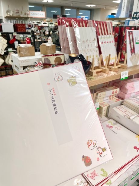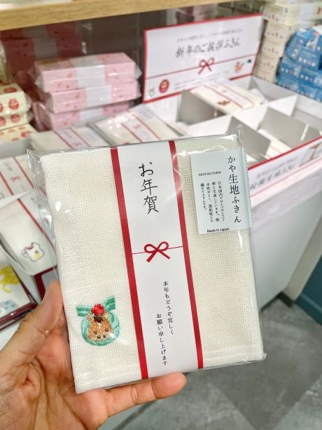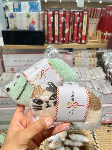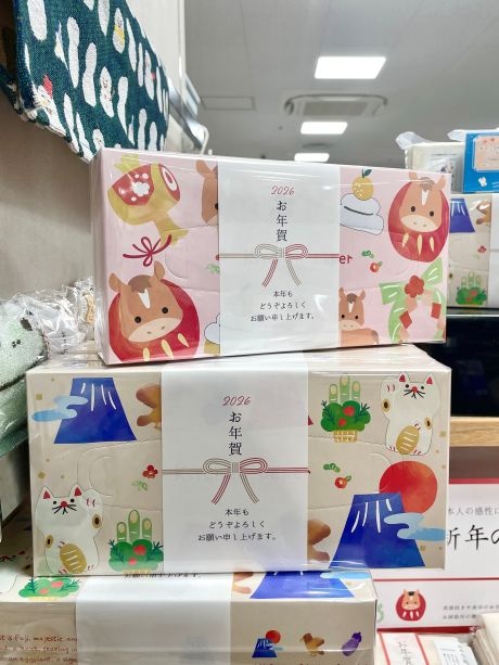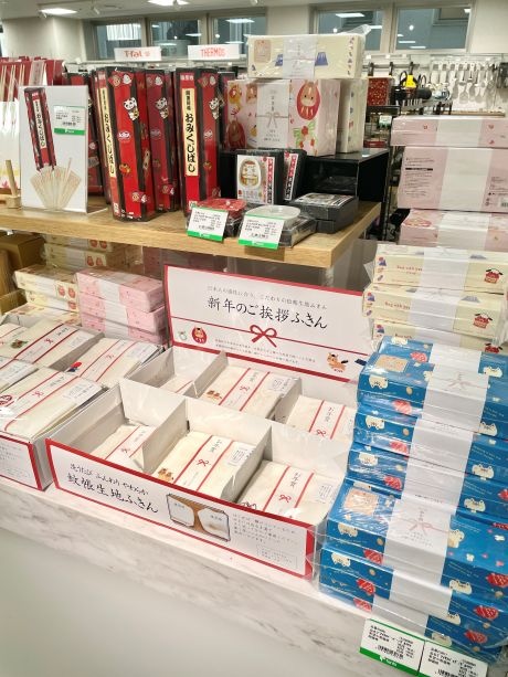 お年賀かや生地ふきんやスポンジ、おみくじばしが大人気!
